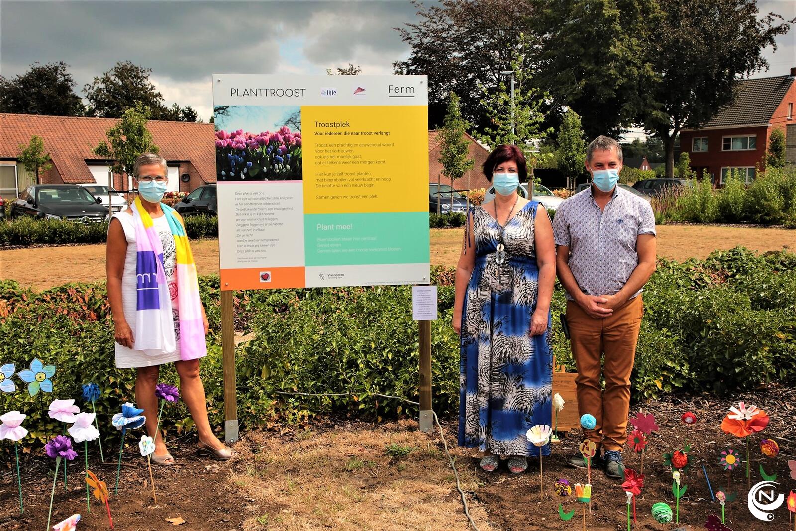 In de tuin van WZC Lindelo Lille heeft vrouwenbeweging Ferm vanmiddag de eerste troostplek van de provincie Antwerpen ingehuldigd. Iedereen die tijdens de covidcrisis een dierbare heeft verloren, kan vanaf nu er troost vinden en een bloembol planten.