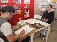Marjolein (11) en Hanne (13) uit Herentals : 'Heel cool zo'n bib-verwendag. We hebben een toffe schets van cartoonist Marin gekregen. Die hangen we zeker op in onze slaapkamer. Ook hebben we ons haar laten doen in het kapsalon, kei-show. Toch wel een toffe plek onze bib, we komen hier vaak boeken lenen. Een schat aan leerrijke boeken hier!'