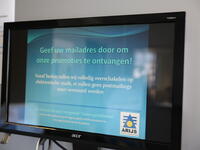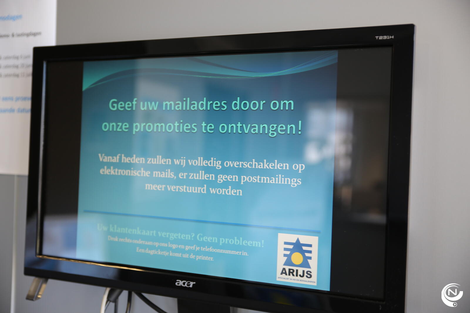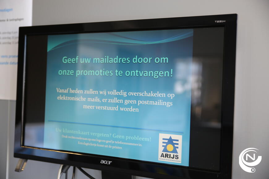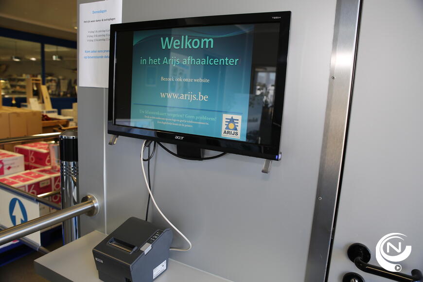 Als je toch eens je klantenkaart vergeten bent, klik je op het Arijs-logo op het lcd-scherm aan het toeganspoortje van de winkel, geef je telefoonnummer in, en neem de print met barcode mee.  Dat is nieuw, een extra dienstverlening voor de klanten.
