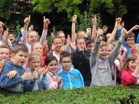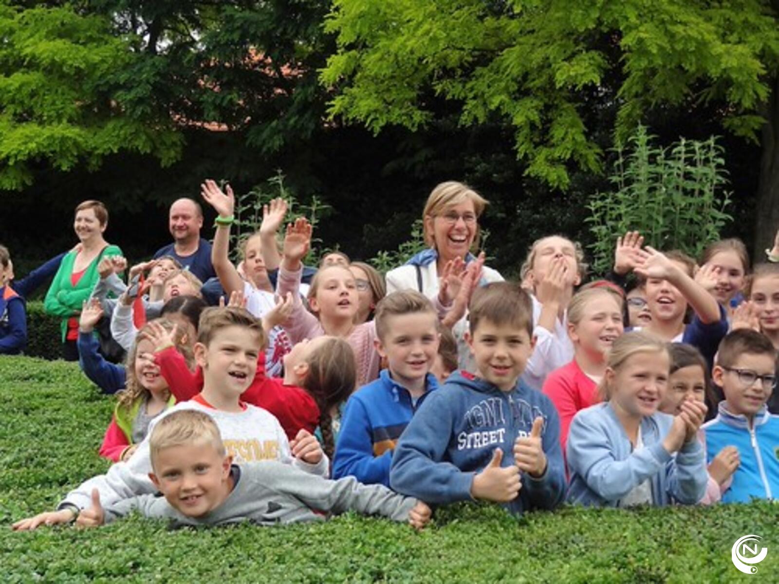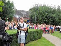 De tortelduifjes maakten de verplaatsing naar het gemeentehuis met de helikopter. Belle en Wouter zagen er overgelukkig uit. Op het grasveld van het gemeentepark werden de bruid en bruidegom door de kinderen van de lagere gemeenteschool op applaus onthaald.
