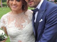 Belle Perez droeg een prachtig wit kleed, bovenaan met kant afgewerkt, achteraan met open rug, en onderaan een beetje sleep. Wouter Van der Horst droeg een strak blauw pak met wit hemd en blauwe strik. Het bruidsboeket bestond uit mooie witte pioenen.