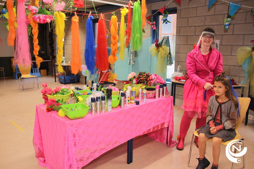 Bib Neteland organiseerde vandaag 'coronaproof' haar jaarlijkse verwendag. 'Een verwendag om nooit te vergeten in Bib Neteland', lachen Janne en Nelle Van Laere uit Herentals. 'Ik vind de voorleesexperte Inge Umans heel leuk. Ook Kaatjes Kinderkapsalon is keicool. Ik laat m'n kleurig kapsel en hippe hanenkammen staan. Misschien mag ik van m'n ouders er maandag mee naar school. (lacht)