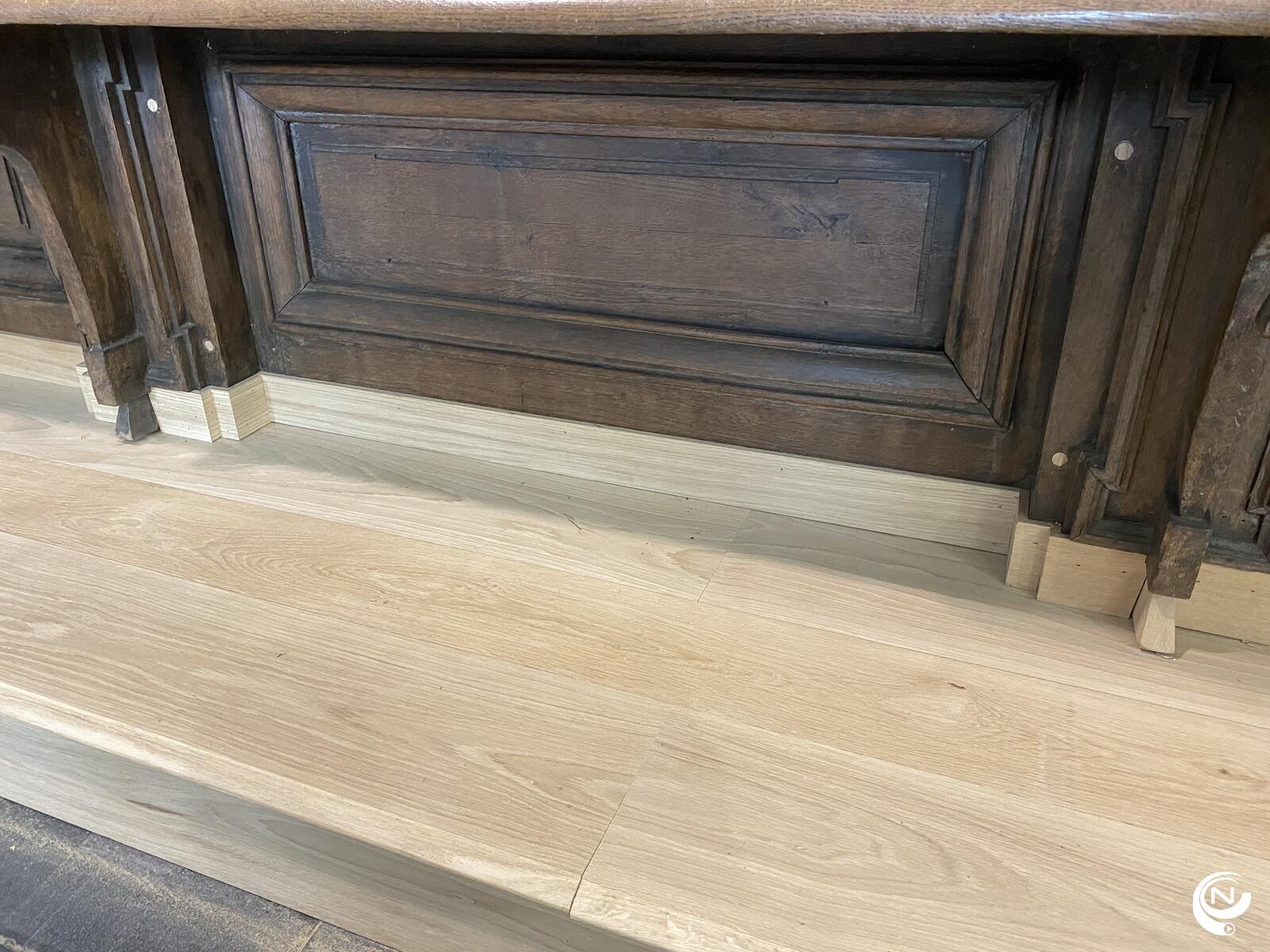Onder de lambrisering is er over de hele lengte van de kerk langs beide zijden een trede in hout. Die tredes waren heel sterk aangetast door ongedierte én door water. Vroeger werd er namelijk bij het poetsen van de kerk vaak veel te veel water gebruikt. Mensen herinneren zich nog hoe de vorige pastoor daarbij wel eens een tuinslang hanteerde…