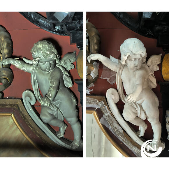 Foto’s: architect Philip Baelus - projectleider Céryl Locht - ‘houttovenaars’ Dave en Bruno in overleg - vier van de zes dames restaurateurs - restauratrice Clara aan het werk - het blootleggen van de muurschildering - muurschildering met optische illusie - altaarengel voor en na reiniging - gerenoveerde panelen van de lambrisering - afwerking tot in de kleinste détails.