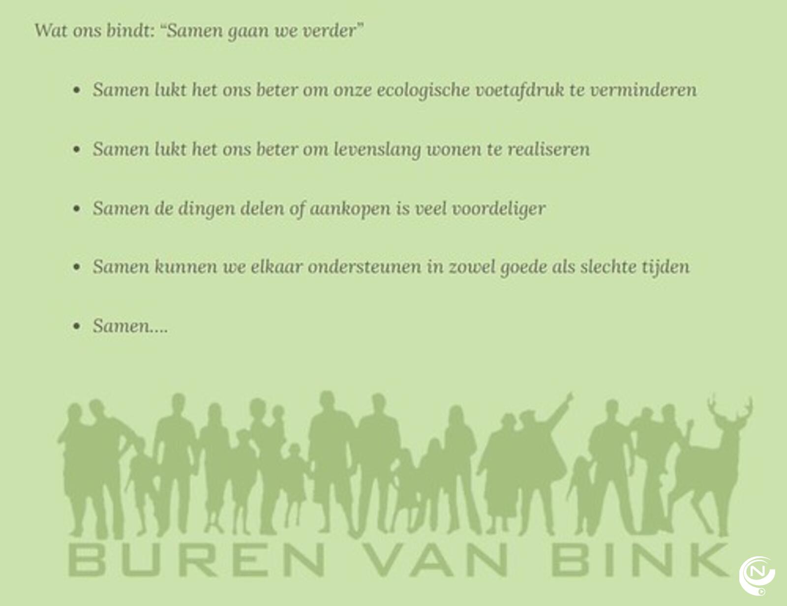 Buren van Bink zal warmte en leven brengen in een fijne straat. Iedereen die constructief samenwerkt met ons voelt de betrokkenheid, de solidariteit die centraal staan in een woonvorm waar mensen tuin, werkhuis, auto's, gemeenschappelijke ruimtes met elkaar willen delen.
