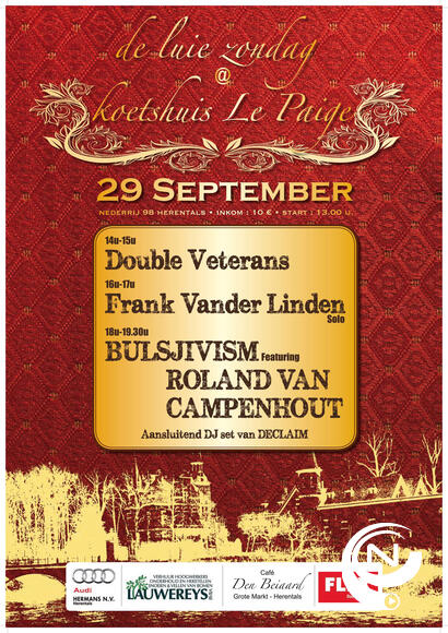 "De Luie Zondag" - een nieuw festival in Herentals Herentals 04/09/2013 - 16:13 1 minuut Gepost door Op zondag 29 september 2013 heeft in het schitterende decor van Koetshuis Lepaige op de Nederrij 98 een nieuw festival plaats. "De Luie Zondag", zo heet dit festival, pakt op deze eerste editie alvast uit met een dijk van een affiche. Double Veterans, Frank "De Mens" Vander Linden solo, en Bulsjivism feat. Roland Van Campenhout zullen er het beste van zichzelf geven. Aansluitend is er nog een dj-set tot 23u. De deuren gaan open om 13u en de inkom bedraagt 10 euro.