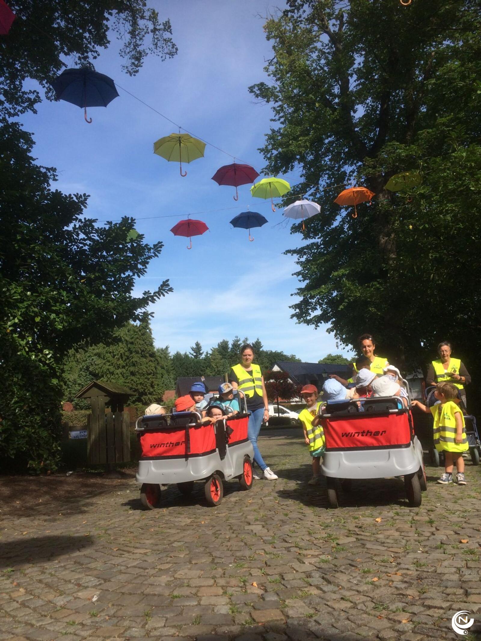De Zomer van Wechel is nu wel heel concreet. 'Dag vrienden, gisterenmorgen hebben wij onze parapluutjes in het voorpark van het Hof d'Intere opgehangen. In volle ambiance kregen wij het bezoek van onze jongste kunstliefhebbers, de kleuters van de kinderopvang. Twee volle karretjes en de grootsten wandelden aan de hand mee.