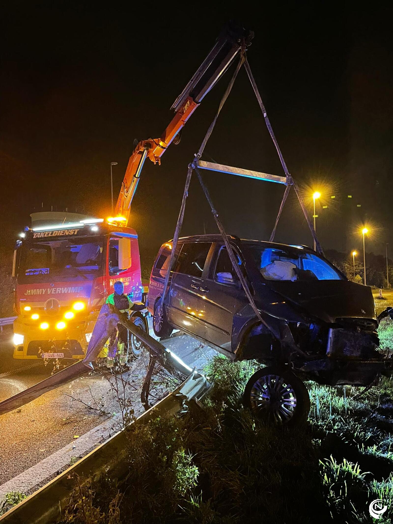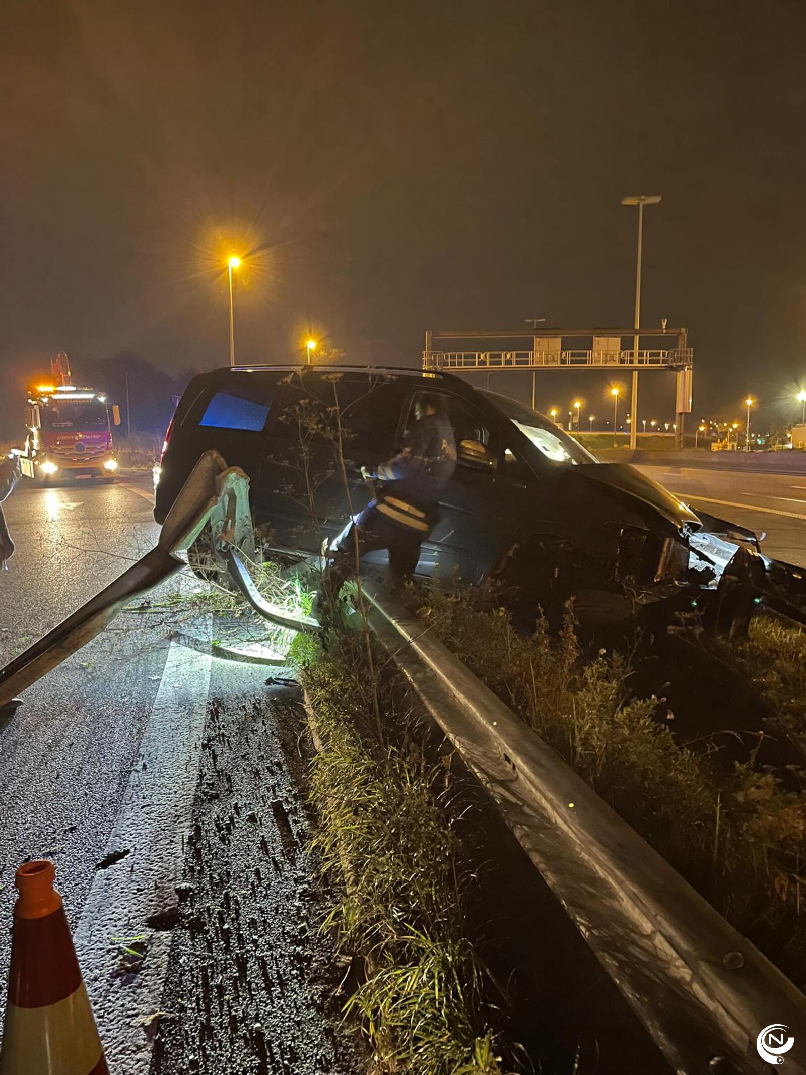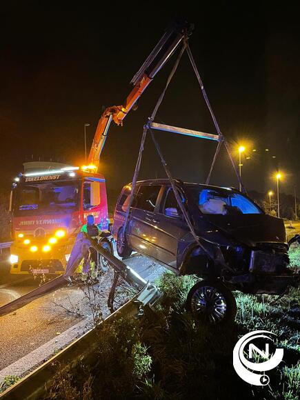 Bij een 2e ongeval rond 03.20u uur ging een wagen uit de bocht op de oprit Geel-West. De auto ging over de vangrail en belandde in de struiken. Er vielen geen gewonden. (pol) Foto's J. Verwimp/Nnieuws.