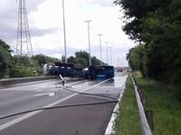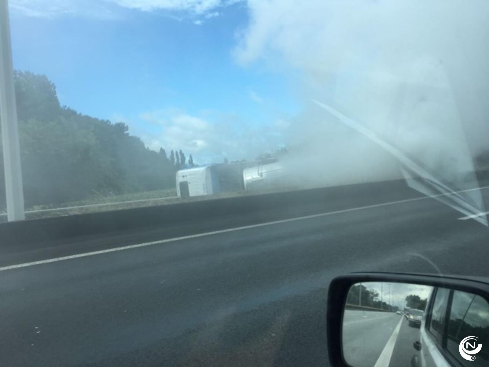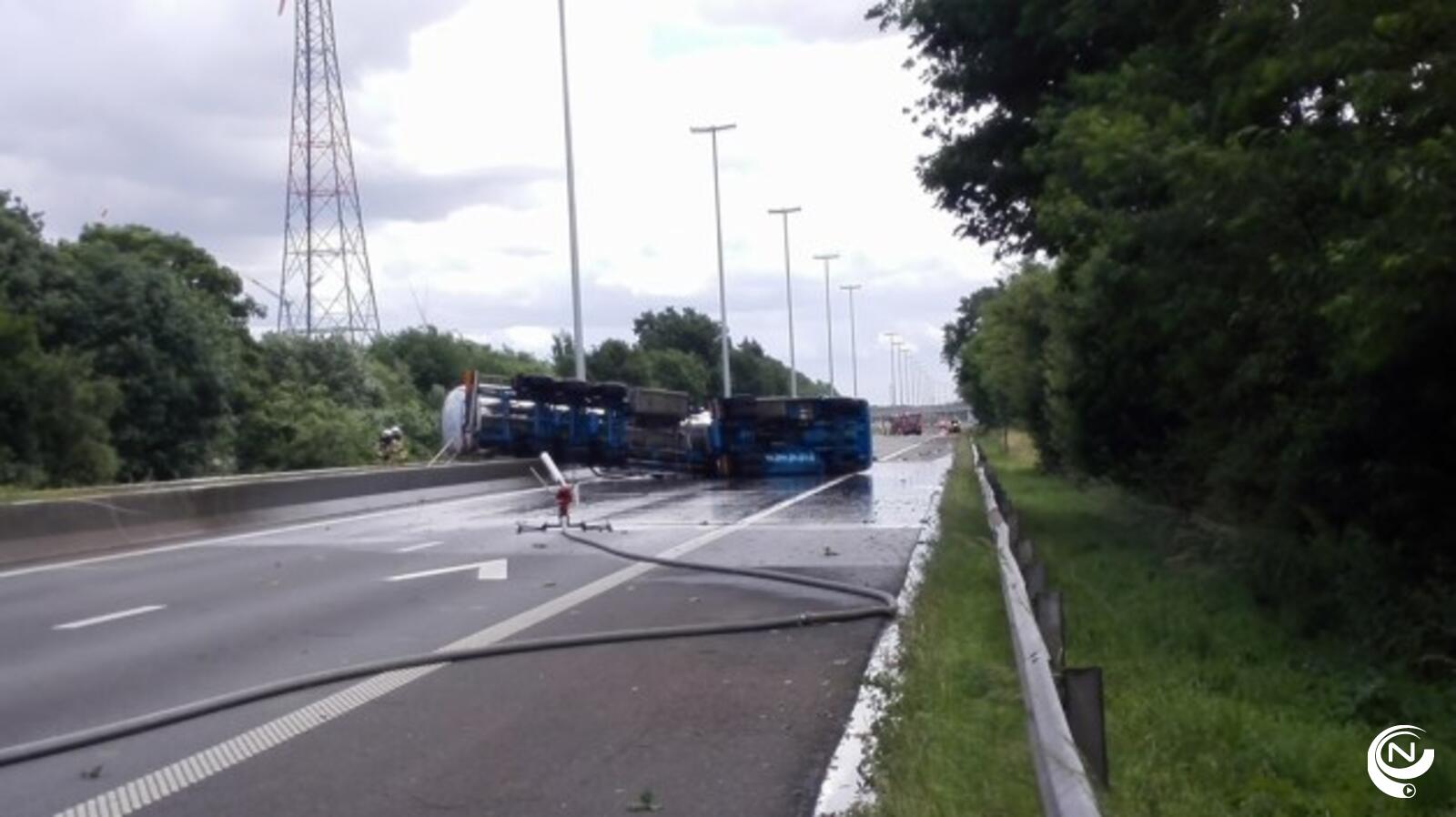 Het ongeval gebeurde tussen afrit Geel-Oost en afrit Ham richting Lummen. De vrachtwagen is geladen met waterstofperoxide. Er is een wolk met licht irriterende stof ontsnapt, maar de situatie is onder controle. Er is geen gevaar voor de omwonenden.