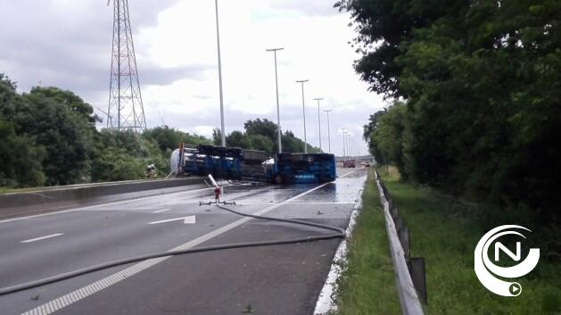 De hinder zal nog een hele tijd aanhouden, wellicht zelfs tot na de avondspits. "Rij om op lange afstand indien mogelijk. Vermijd de zone!" Het verkeer dat van Hasselt naar Gent moet, rijdt dus beter om via Brussel. Wie van Antwerpen naar de Kempen gaat, neemt beter de E34. (foto's Twitter)
