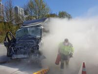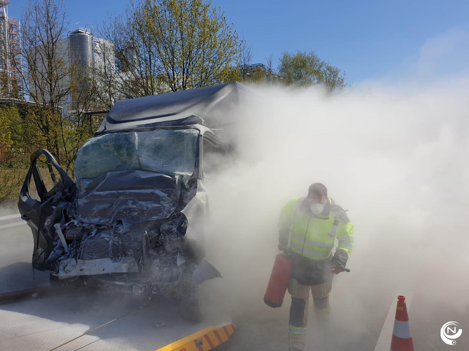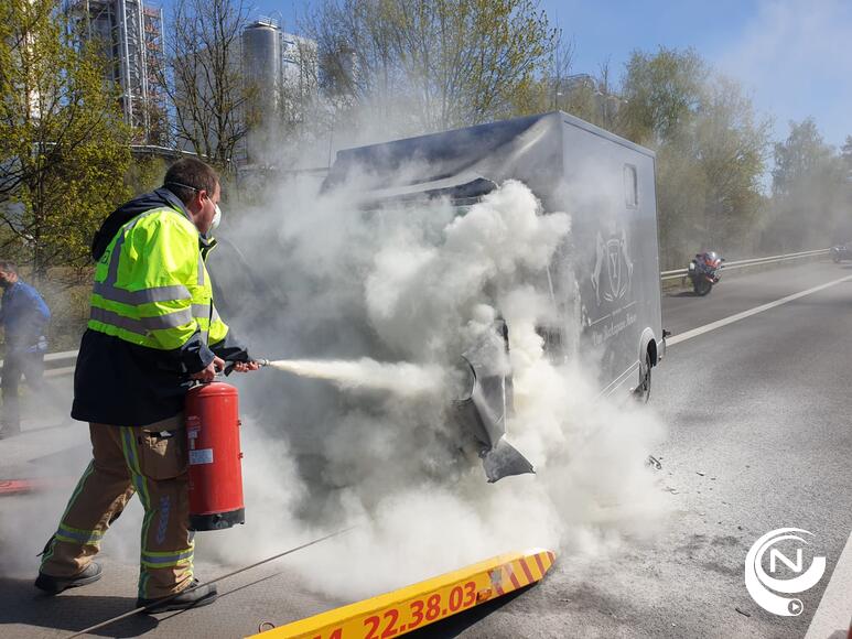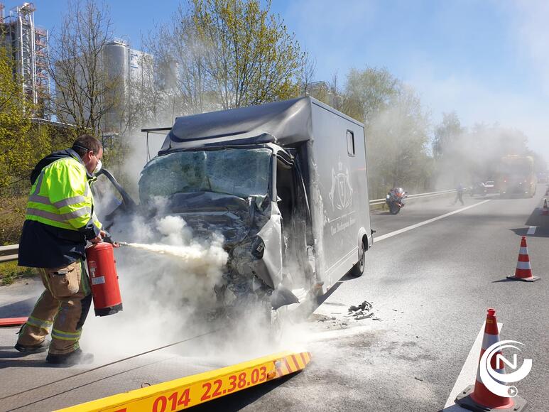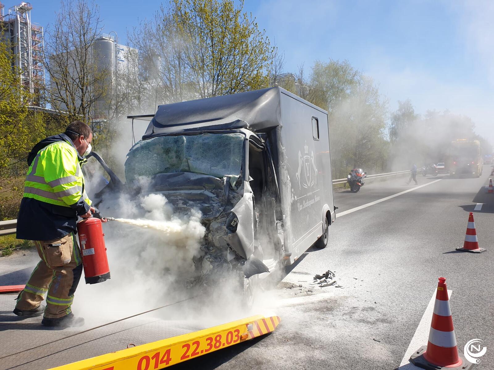 Het voertuig begon na de klap te smeulen maar de brandweer had het vuur snel onder controle.  Gelukkig vervoerde de bestelwagen op het ogenblik van de calamiteit geen paarden.