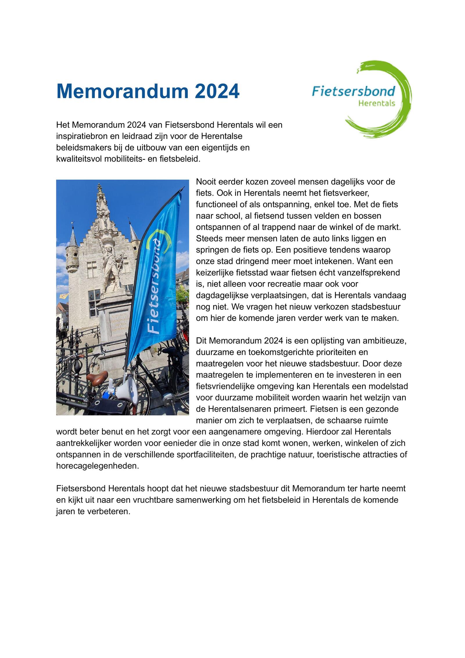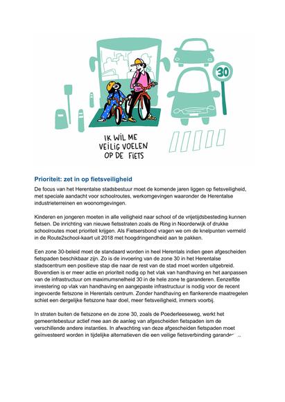 Met dit memorandum wil de Fietsersbond de aandacht vestigen op de dringende noodzaak van een veiliger, duurzamer en fietsvriendelijker Herentals.