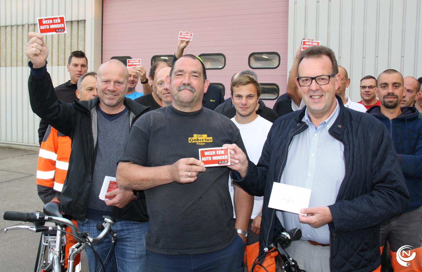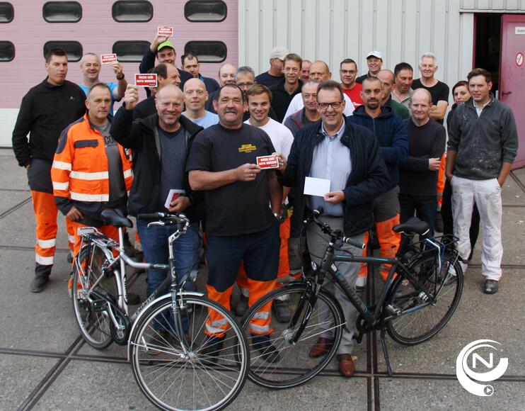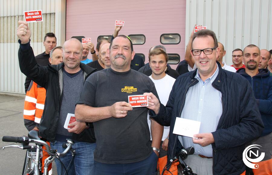 Schepen voor Mobiliteit Michel Leys (CD&V) deelde samen met burgemeester Paul Diels (CD&V) fietsplaatjes uit van 11.11.11 met de boodschap 'Weer een auto minder'.