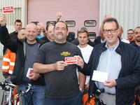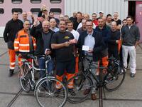 Elke personeelslid dat met de fiets kwam, ontving zo'n plaatje. Op de achterzijde stond een nummer waarmee de werknemers de fietswielverlichting konden winnen. "We deelden ruim 50 plaatjes uit", weet Michel Leys. "We hebben de traditie om onze werknemers regelmatig te overtuigen om met de fiets te komen. Wie dat doet, krijgt sowieso een fietsvergoeding. Daarnaast doen we af en toe een extra actie. Zo deelden we al appels uit en hebben we een ontbijt gegeven aan de meest fervente fietsers." Foto's W. Godschalk / Mil Cambré / NNieuws.