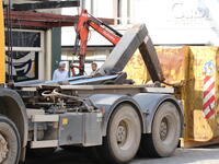Op de Grote Markt in Herentals is vanmorgen een aannemer begonnen met de afbraak van het door een brand verwoeste Gildenhuis. De brandramp vond plaats op 29 november 2015 (video).