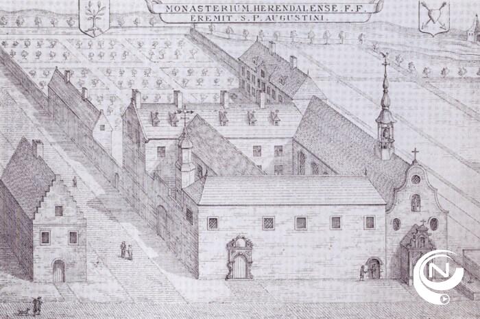 Op de pentekening : zo zag het Augustijnenklooster eruit in de 17e eeuw - de huidige vindplaats van de grafkelders is rechts vooraan / tekening stadsarchief Herentals.