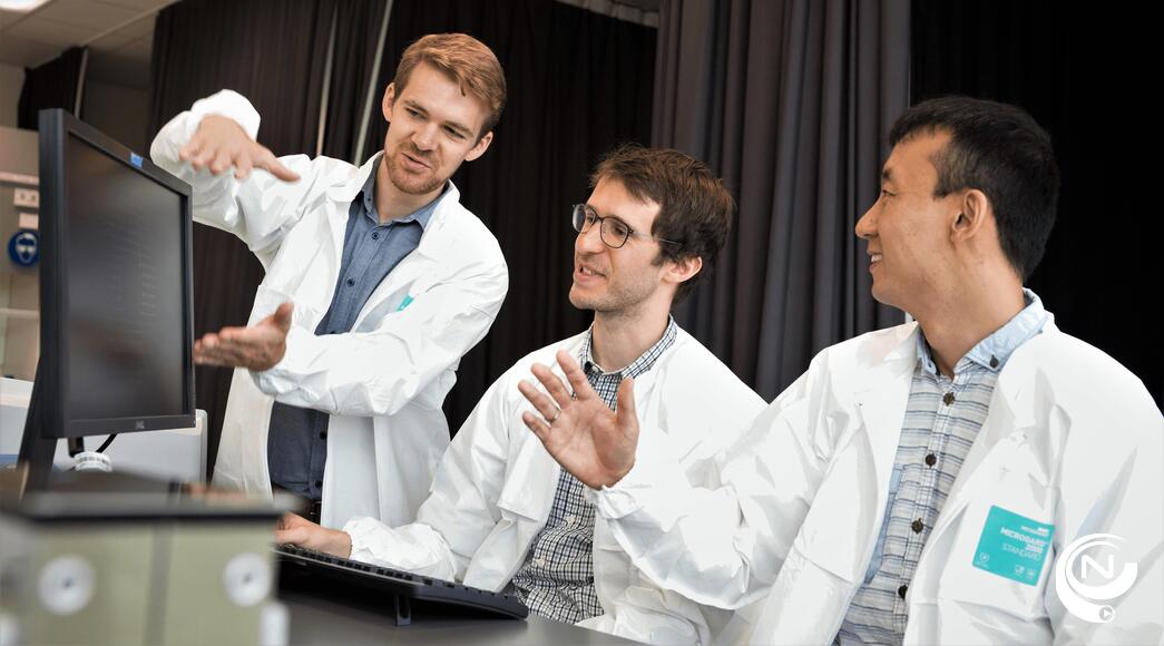 Foto's : Niels Verellen gaat werken aan een microscoop in een chip. Een voorbeeld van hoe de chip er gaat uitzien (© imec) / foto's Karen Levrie / imec / Nnieuws - Guy Verellen.