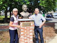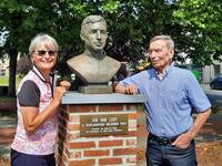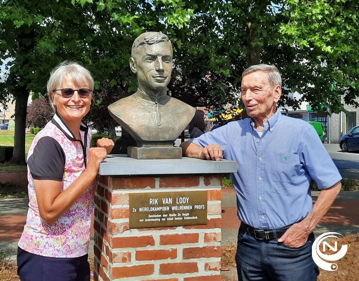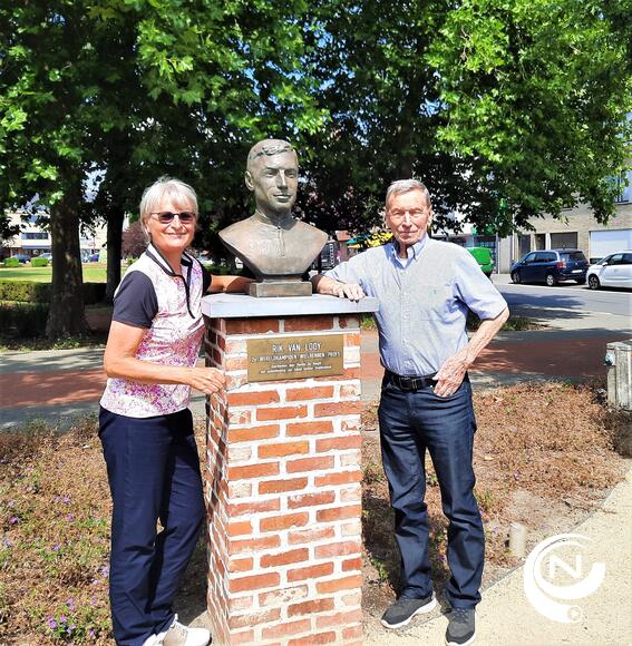 Het was een eer om met z'n sympathieke dochter Joanne samen herinneringen op te halen. Het lijkt lang geleden, maar Tom staat in m'n geheugen gegrift. Z'n plots overlijden tijdens de koers in de Tour de France heeft een diepe indruk op me gemaakt. Het is precies nog maar gisteren gebeurd.' Foto NNieuws/Luc De Voeght - Een vriendenfoto aan het borstbeeld van Rik op het Astridplein in Grobbendonk mocht niet ontbreken.