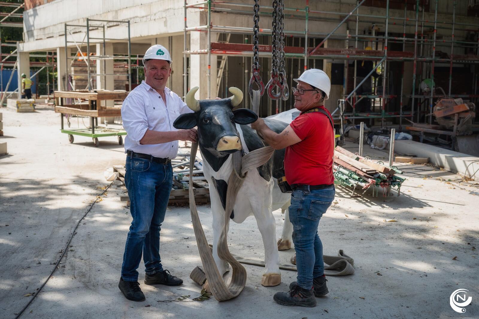 Op de werf van het nieuw gemeentehuis De Meent is vandaag een opvallende verschijning te zien: een koe op het dak.