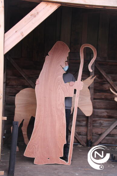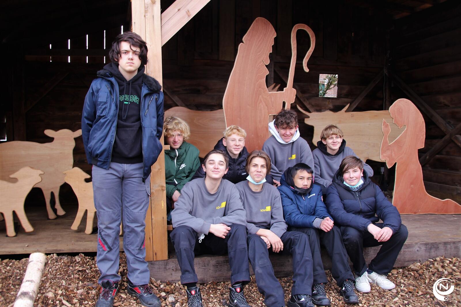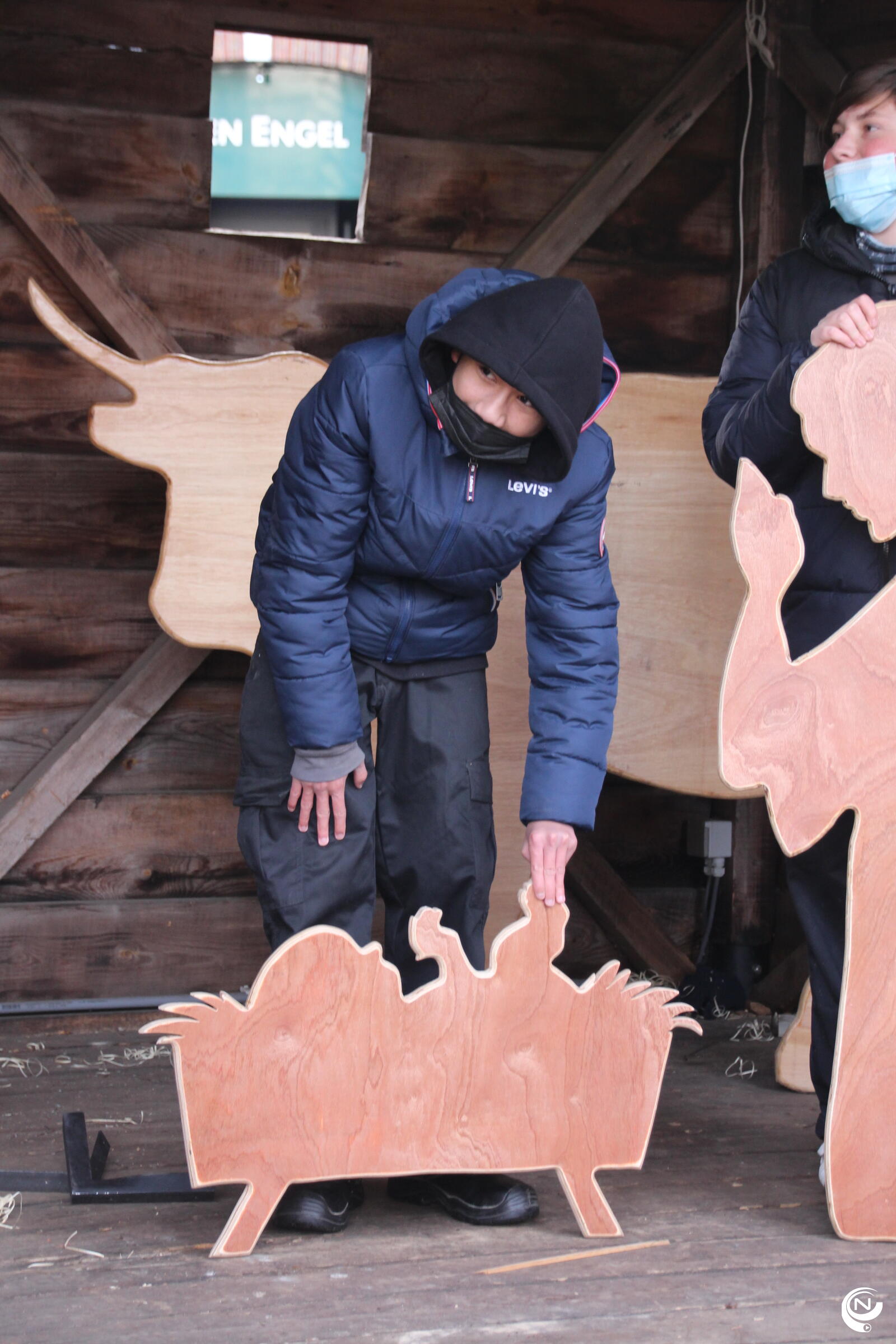 De creatieve leerlingen Steyn, Vin, Rayden, Vince, Tanne, Warre, Jonas, Teenarit, en Noah plaatsten vanmiddag de beelden in de stal.  'We hebben net als bij de andere creaties met een projector de silhouetten op hout geprojecteerd, in verhouding tot de houten dieren die onze leerlingen eerder gemaakt hadden.