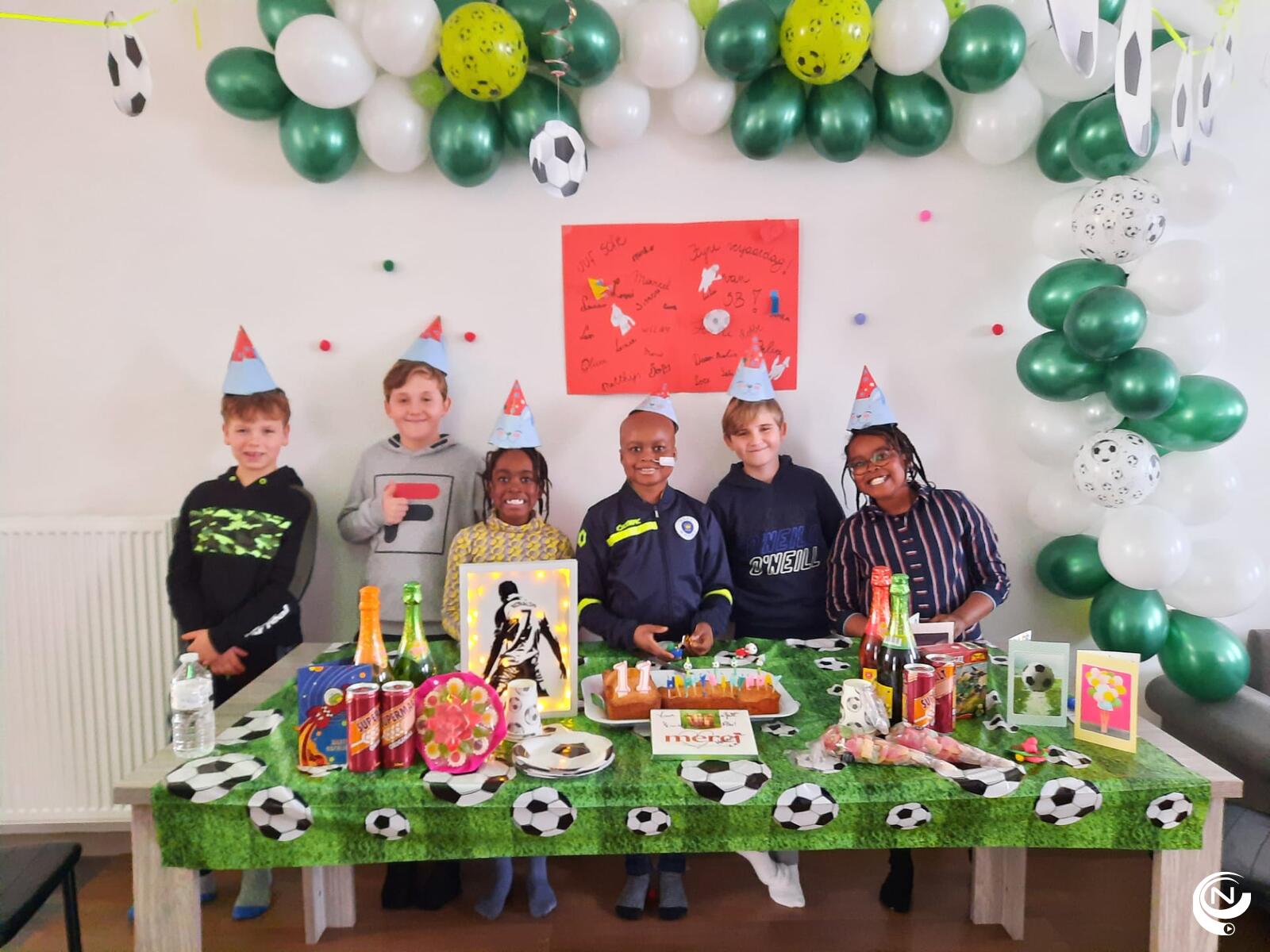 Op de foto : jeugdcoach Mike Schrijvers, Willy, mama Abi en jongerenwerker Vincent Peters.