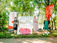 Op de foto : Gedeputeerde Kathleen Helsen, burgemeester Mien Van Olmen en Carina Govaert van Velt plaatsen samen met het team vlaggen op het perceeltje vanmorgen in Koninkrijk. Foto's V. Druart / Nnieuws.