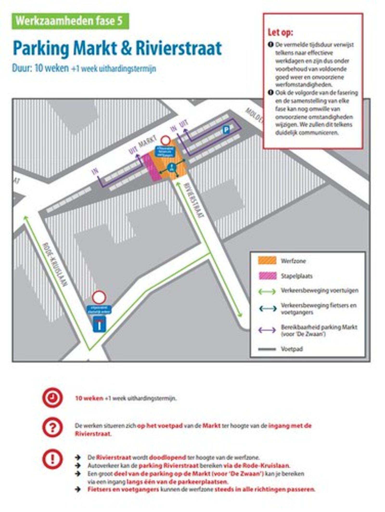 Door de komst van het vaccinatiecentrum op site Rivierstraat verplaatsten we de herstellingen aan het kruispunt Rivierstraat - Markt tot na het bouwverlof. Hierdoor kwam er ruimte in de planning om vanaf 22 maart te starten met deze fase, die oorspronkelijk op een later tijdstip gepland stond.