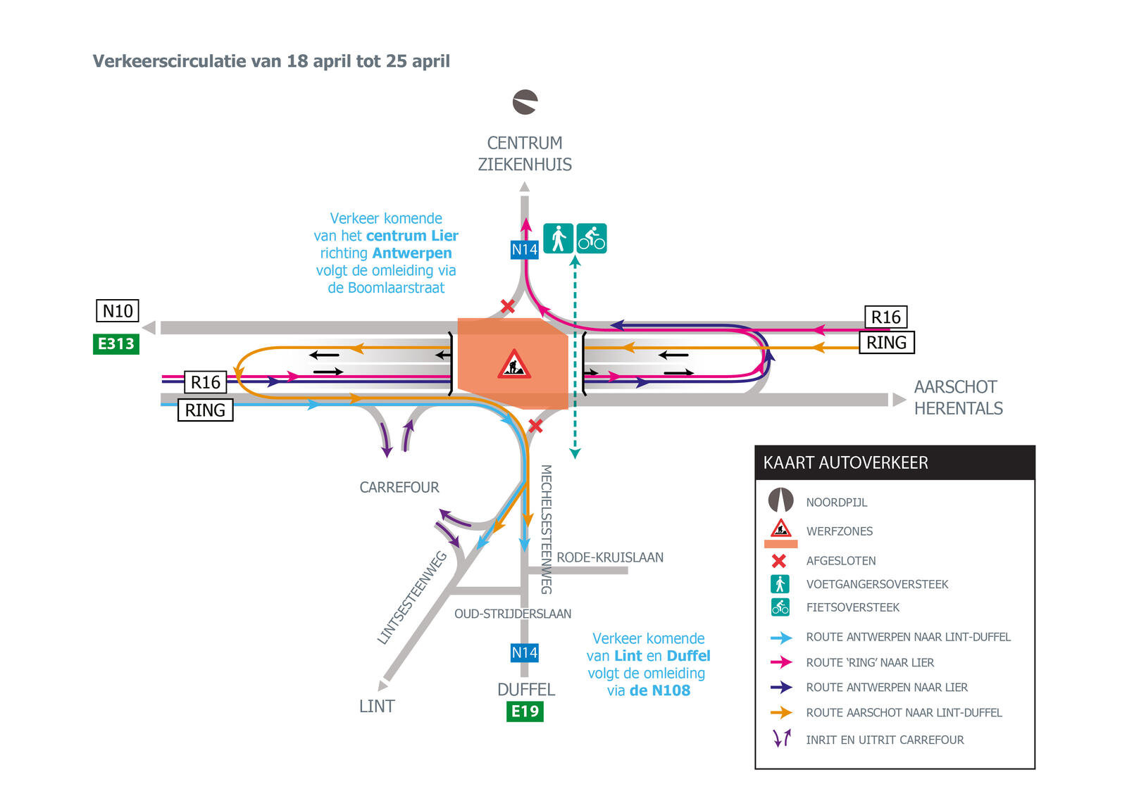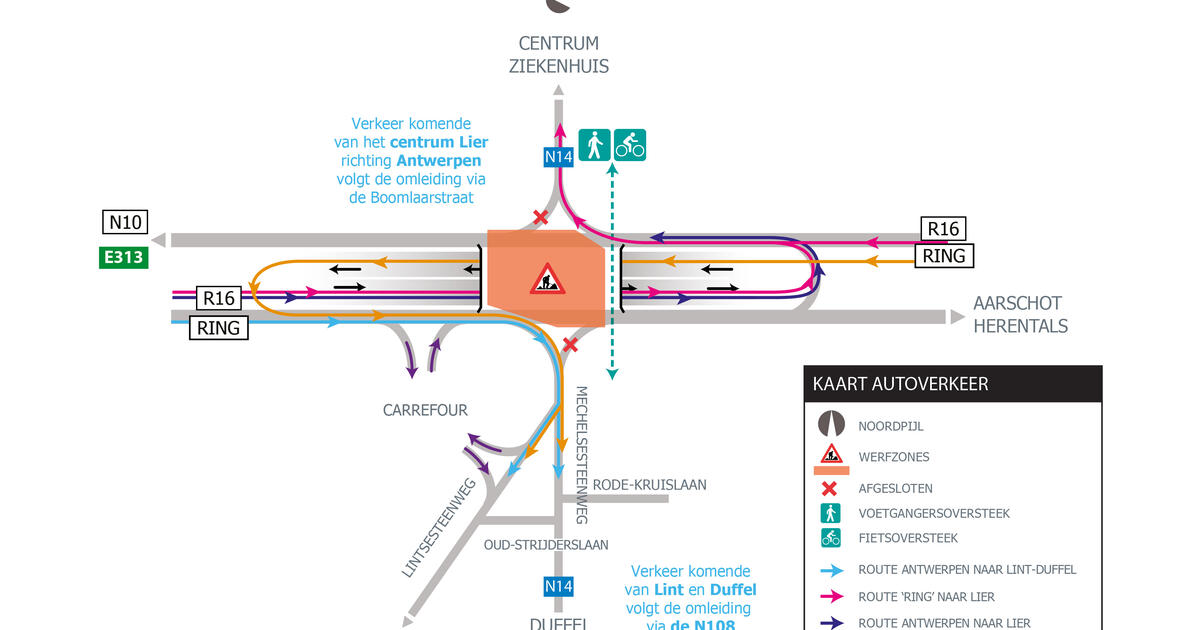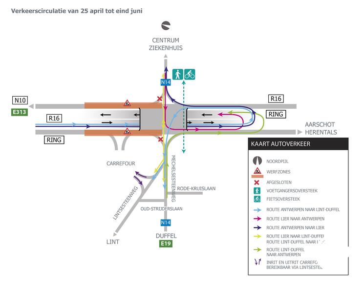 Verkeer richting Duffel en Lint komende van de ring uit de richting van Antwerpen blijft mogelijk, maar komende van Duffel en Lint de Ring oprijden is niet mogelijk. Het verkeer volgt de bestaande omleiding voor zwaar vervoer via de Waversesteenweg (N108). Komende van het stadscentrum kan het verkeer niet rechts afslaan en de Ring oprijden richting Antwerpen.