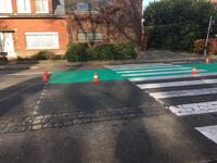 De zebrapaden worden door een externe firma in kunststof (thermoplast) op de rijbaan aangebracht. De witte lijnen steken fel af tegen een helgroene ondergrond.