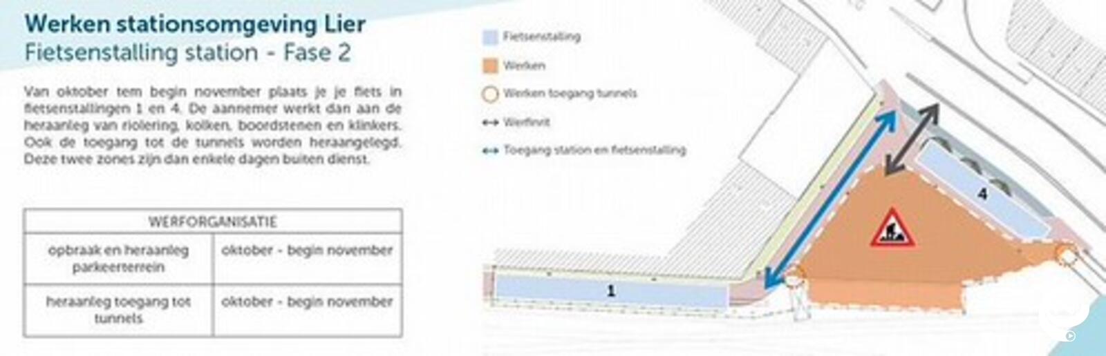 Tijdens deze werken zal steeds 2/3de van de fietsparkeerplaatsen beschikbaar zijn. In een eerste fase verdwijnen de fietsenstallingen in het midden van de parking.