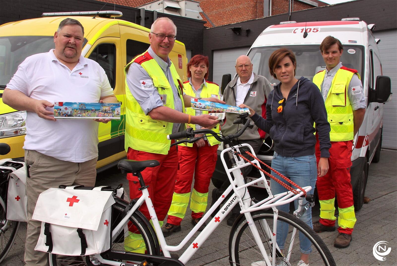 Veldritwereldkampioene Sanne Cant uit Noorderwijk (en toch ook nog een beetje uit Lille...) vindt het een hele eer om de alleréérste zelfklever van Rode Kruis Herentals te mogen aanschaffen.