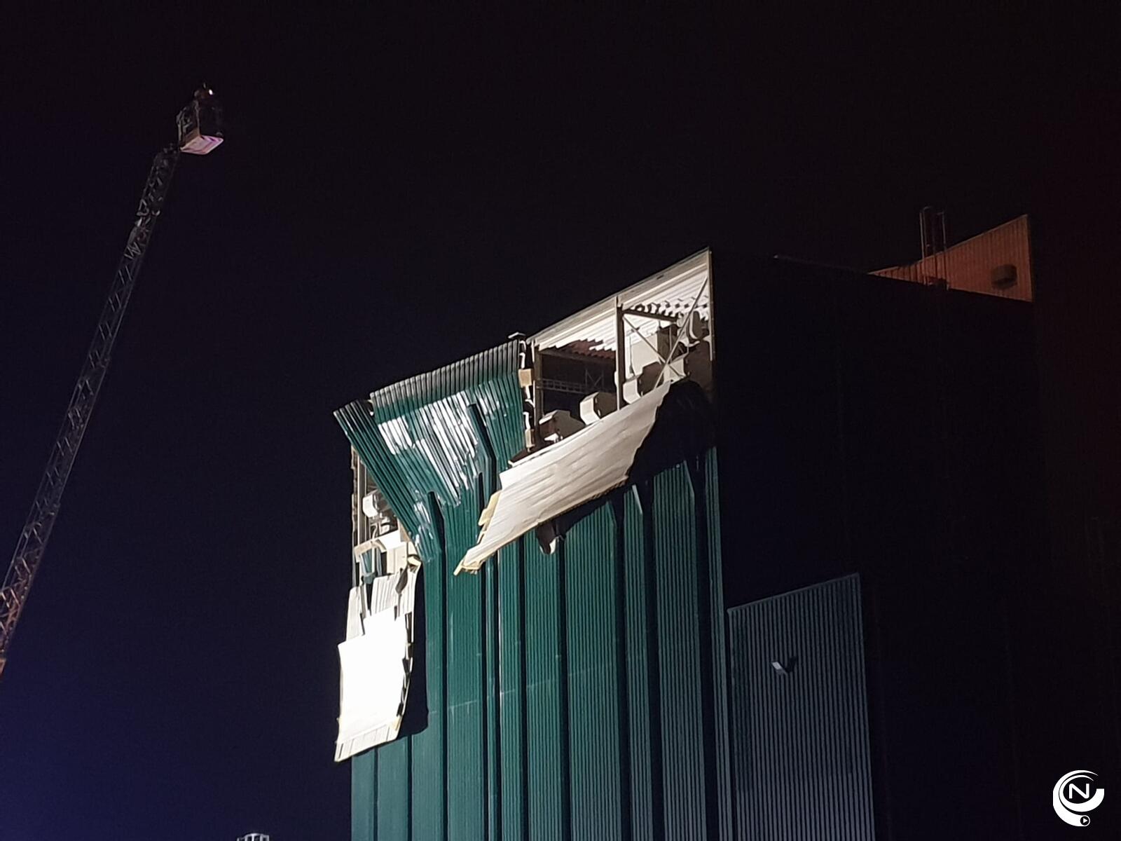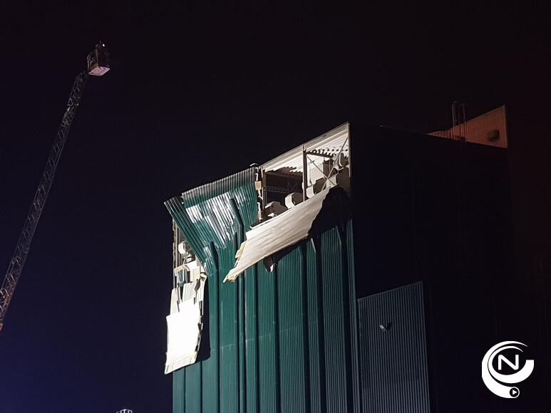 Een deel van de zijwanden werd weggeslagen. Wat de oorzaak van de calamiteit is, is nog onduidelijk. Brandweer Kempen was snel ter plaatse met een hoogtewerker.
