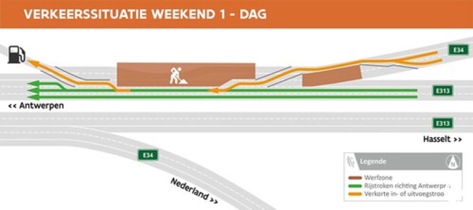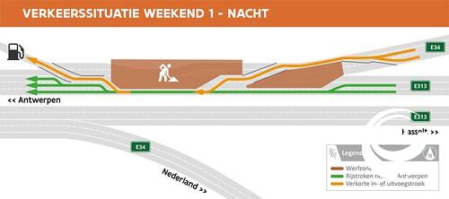Tijdens de eerste twee weekends moet het verkeer op de E34 richting Antwerpen ter hoogte van de bocht van Ranst over één rijstrook, om dan in te voegen op de E313. Het verkeer op de E313 zal overdag steeds over twee volwaardige rijstroken kunnen rijden. 's Nachts moet alle verkeer over één rijstrook.