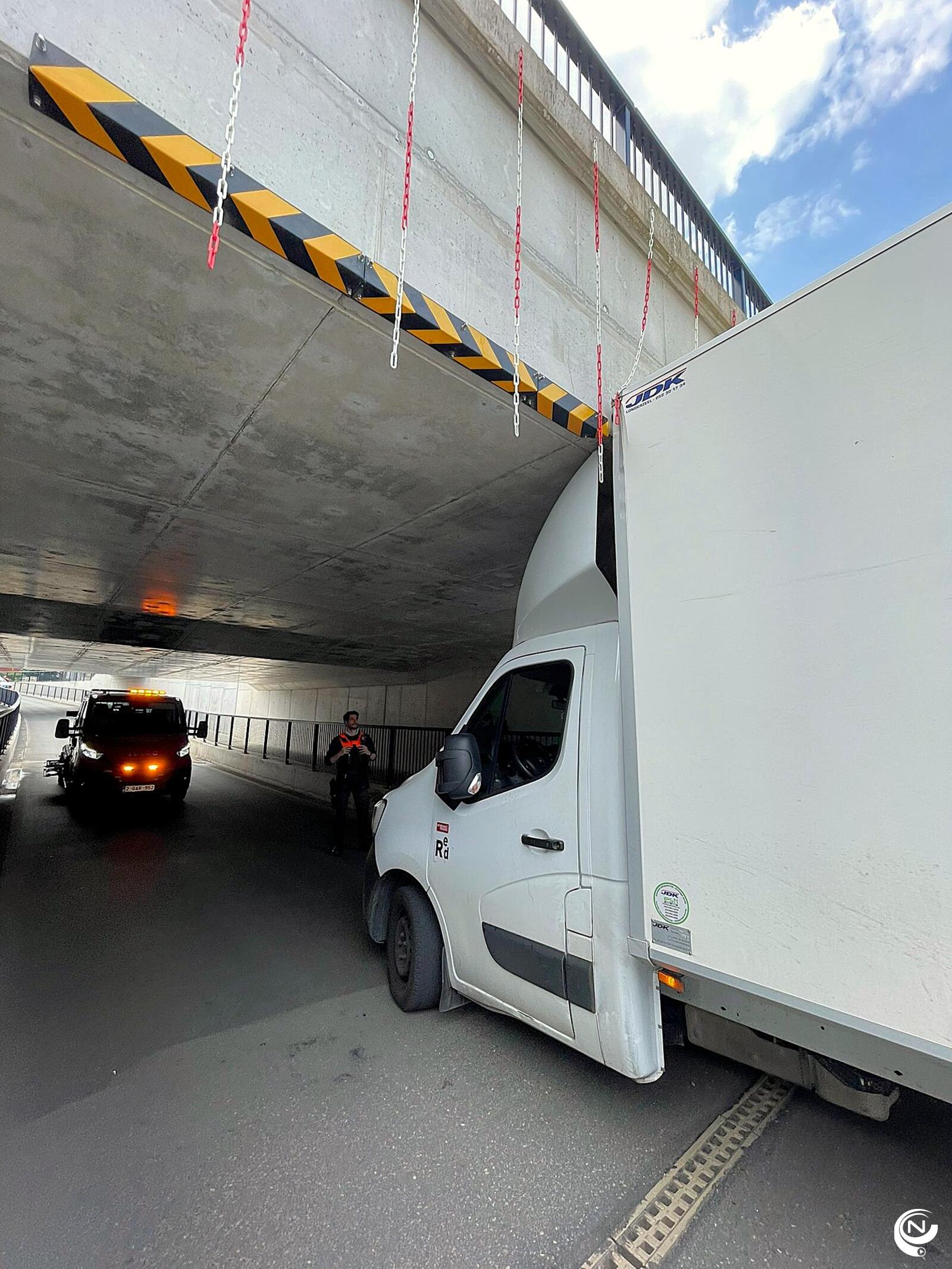Vrachtwagen botst met z'n dak tegen brug van tunnel aan Vossenberg
