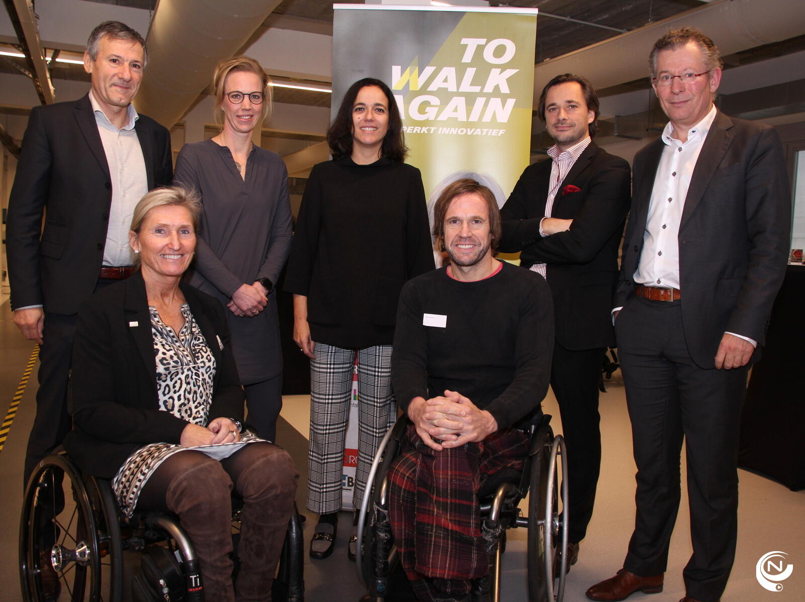 Groepsfoto vlnr : dr. Toon Claes, orthopedisch chirurg AZ Herentals en ondervoorzitter To Walk Again vzw, Kristel Gevaert, algemeen directeur To Walk Again; Dr I. Van Nes, revalidatie-arts St.-Maartenziekenhuis Nijmegen (NL), Prof. J. Bloch, ziekenhuis Lausanne; Marc Herremans, stichter en voorzitter To Walk Again, Prof G. Courtine, voorzitter Spinal Cord EPFL en Dr. S. Deckers, CEO GTX Medical.