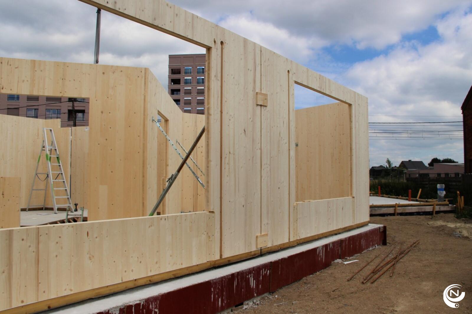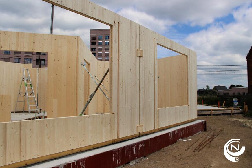 Nu start de montage van de CLT-panelen. Deze bouwmethode kent een snelle montagetijd. Als alles vlot verloopt zal twee weken later het gebouw (voorste blok gelijkvloers en eerste verdieping en achterste blok gelijkvloers, eerste en tweede verdieping) rechtstaan.